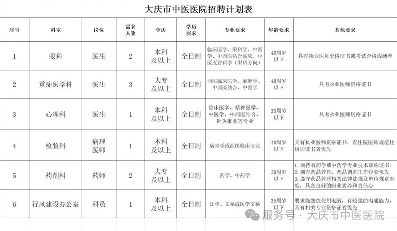 因工作需要,现大庆市中医医院拟招聘工作人员,具体要求如下: