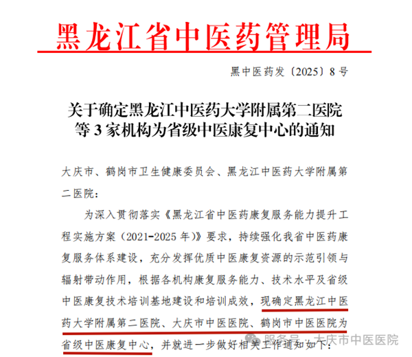 近日,从黑龙江省中医药管理局传来喜讯,我院成功获评省级中医康复中心,成为此次省内仅有的三家省级中医康复中心之一,标志着我院中医药康复服务能力已跻身省内先进行列,彰显了我院在中医康复领域的深厚积淀与核心竞争力。