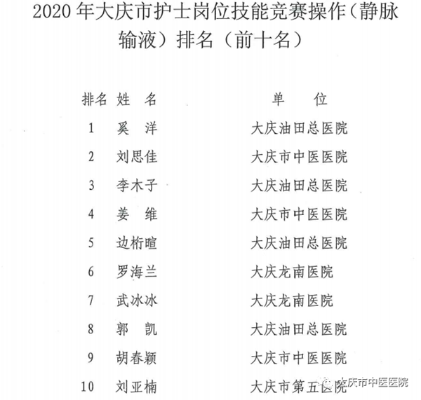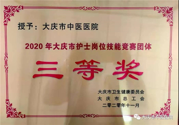 近日,在“大庆市2020年护士岗位技能竞赛”中,大庆市中医医院护理团队经过激烈比拼,团体及个人均获佳绩。此次竞赛由大庆市卫生健康委员会和大庆市总工会联合主办,大庆医学高等专科学校护理系承办。来自全市16家医疗机构的38名优秀选手参赛。
