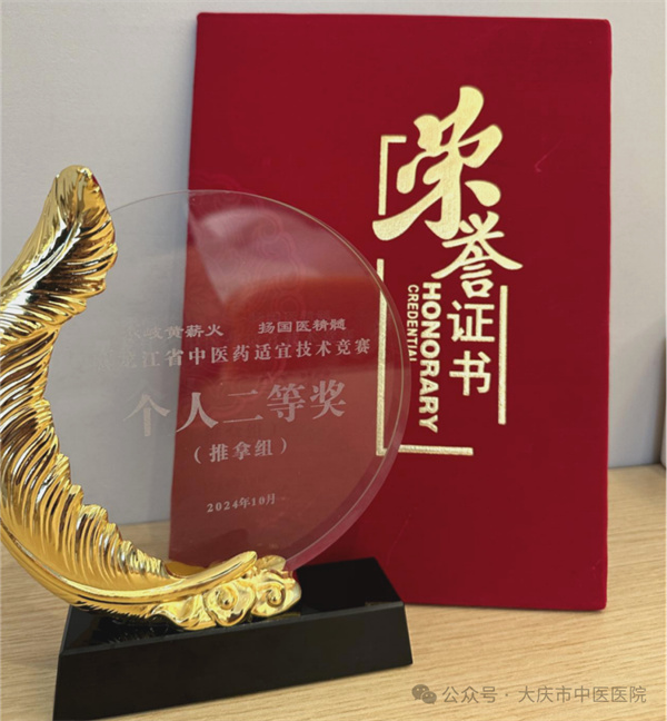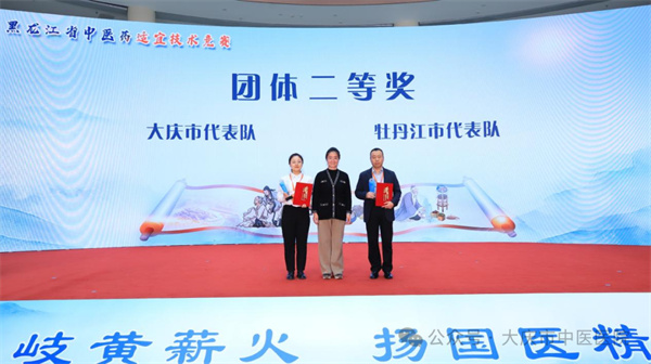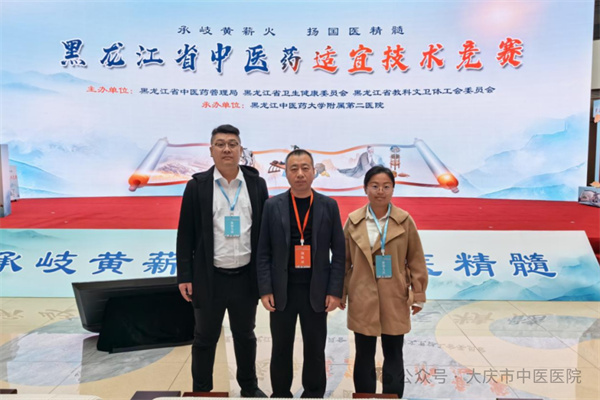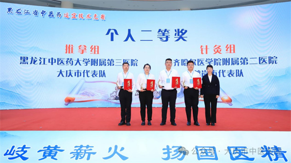 10月21-22日,由大庆市卫健委中医科科长高超带队,大庆市中医医院推拿科医生吴浩、大庆市中西医结合医院针灸科医生王尚巍组成的大庆市代表队,在由黑龙江省中医药管理局、黑龙江省卫生健康委、黑龙江省教科文卫体工会联合主办,黑龙江中医药大学附属第二医院承办的“承岐黄薪火,扬国医精髓”黑龙江省中医药适宜技术竞赛中与来自全省医疗机构的22支代表队44名参赛选手展开激烈角逐,并获得了团体二等奖的佳绩。同时,我院医生吴浩凭借丰富的临床经验和精湛的技艺从推拿组中脱颖而出,获得了推拿组个人二等奖的殊荣,为医院及大庆市争得了荣誉。