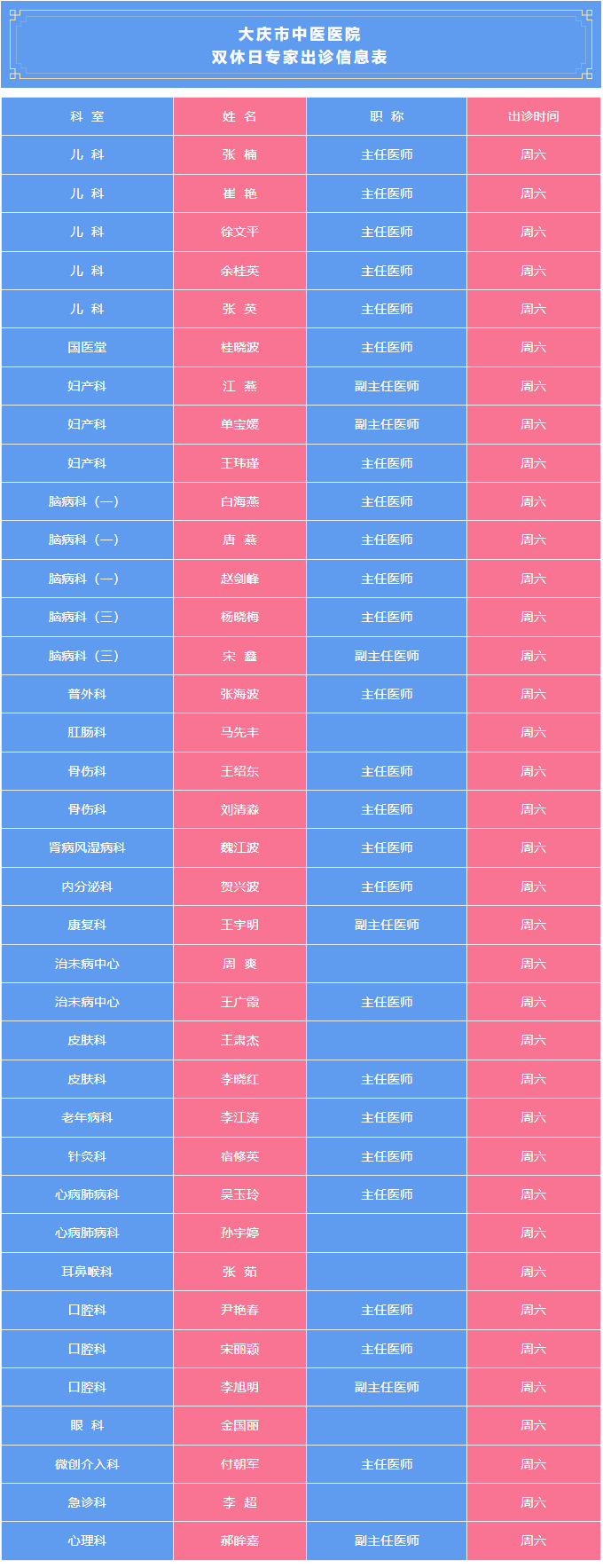 为牢固树立人民至上的理念,大庆市中医医院持续推行“无假日”医院,以更实的举措、更实的成效为患者提供良好就医环境和条件,满足患者对中医药的诊疗需求。现将4月26日专家出诊信息公布如下: