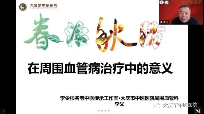 黑龙江中医药大学附属第一医院副院长张铁林,国家名老中医李令根教授,黑龙江中医药大学附属第一医院周围血管病一科科室负责人、省中医外科专科联盟主席高杰教授,北京中医药大学鞠上教授,龙中医一院赵钢教授,龙中医二院郭伟光教授,龙中医一院姜家康教授、高杰教授、贾振教授、孙秋主任等专家线上开展讲座交流。大庆市中医医院周围血管科主任李义也受邀进行了《“春治秋防”在周围血管病治疗中的意义》专题讲座,全省各市县医疗单位近200余人参与此次线上交流。