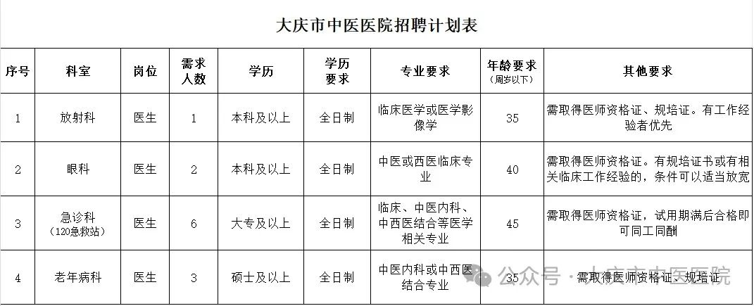 因工作需要,现大庆市中医医院拟招聘工作人员,具体要求如下: