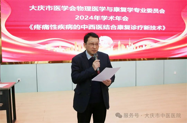 大庆市中医医院副院长、大庆市医学会物理医学与康复学专业委员会主任委员王军主持会议并致词。王军主委表示大庆市中医医院作为大庆市医学会物理医学与康复学专业委员会主委单位,始终践行着为广大患者和油城百姓“康复事业”保驾护航的职责和使命。积极配合大庆市医学会物理医学与康复学专业委员会各项工作,先后邀请了多位全国知名的康复专家,举办多次大型学术会议,为大庆地区康复专业水平的提高做出了卓越的贡献。今后大庆市中医医院将继续致力于康复学科的发展建设,为大庆市康复事业的发展贡献力量。