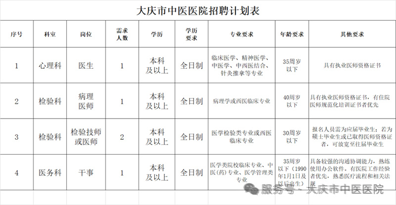 因工作需要,现大庆市中医医院拟招聘工作人员,具体要求如下: