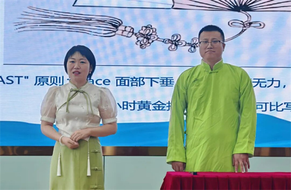 脑病科(三)医生蒋大伟、马艳鹤表演的相声《说说中风那点事儿》和心理科医生闫叶星、李聿带来的英文诵读及歌曲《当你老了》为活动增添了轻松气氛和多元文化氛围,在寓教于乐中展现了中医人的卓越风采。
