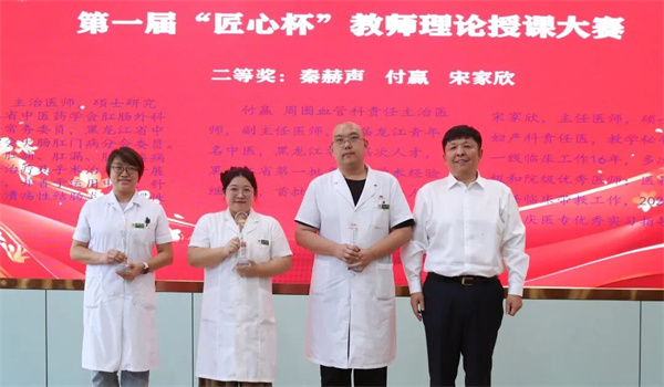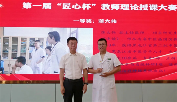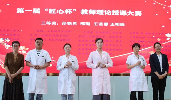 副院长张丽娜宣读《大庆市中医医院“匠心杯”“仲景杯”双赛及规培评优表彰通报》。院领导班子成员分别为第一届“匠心杯”教师理论授课大赛获奖选手、第三届“仲景杯”中医经典诵读大赛获奖选手及集体颁发奖杯,对中医规培优秀轮转科室及优秀师资进行表彰。