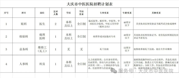 因工作需要,现大庆市中医医院拟招聘工作人员,具体要求如下: