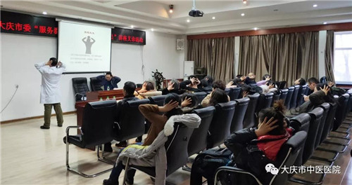 市中医医院副院长王军首先作了《颈椎病的康复与保健》的科普讲座,为大家详细讲解了颈椎病的发病机制、临床表现;生活中如何避免颈椎病发作和如何进行简易治疗,并传授大家如何正确进行保健按摩;牵伸颈部周围肌肉、核心肌肉的激活训练;演示了传统养生功法八段锦的基本动作。